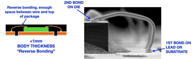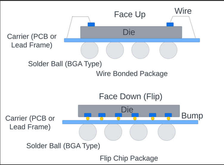 Chips are attached to a package substrate (or leadframe) and connected via fine wires (typically copper)
