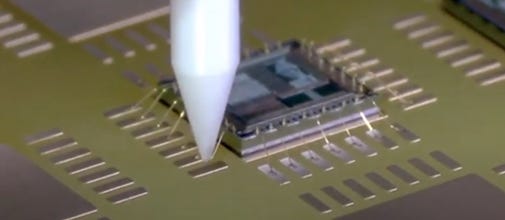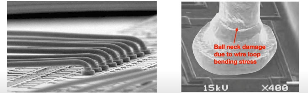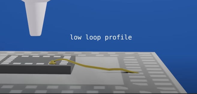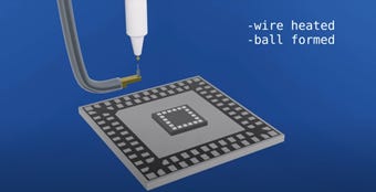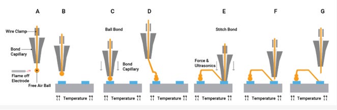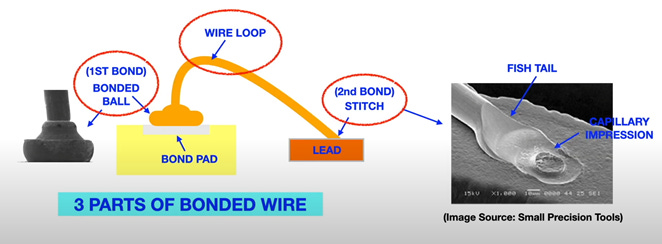 Capillary then presses the ball onto the die’s bond pad, while applying force, heat and ultrasonic energy (i.e. thermosonic bonding)