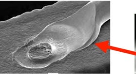 A bonding capillary (the pen like tool) has a tiny hole that feeds the wire through